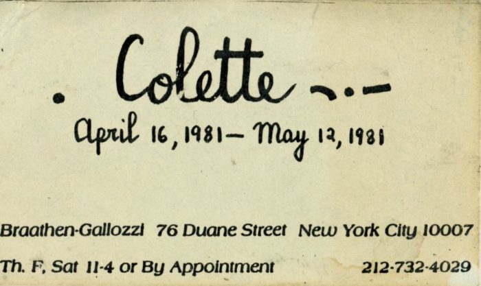 The artist Colette found that business cards were an inexpensive and convenient way to let people know about her exhibition at the Braathen-Gallozzi gallery (1981).
