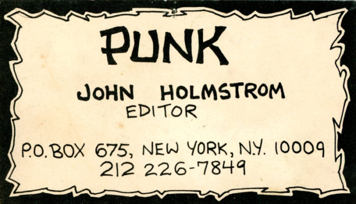 John Holmstrom was the editor and in-house cartoonist for Punk Magazine. Here he applied his lettering skills to create a business card that reflects the magazine’s cartoon aesthetic (c. 1977).