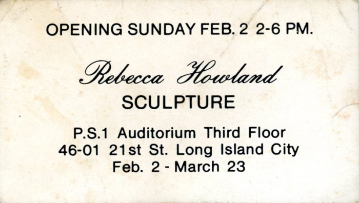 This 1986 card provided artist Rebecca Howland with an inexpensive way to let people know that her Transmission Tower sculptures were on display at the alternative art space P.S. 1, a huge, former schoolhouse that always featured multiple exhibitions.