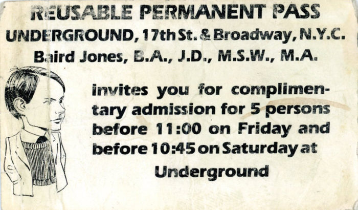 Nightclub promoter and party curator Baird Jones always handed out cards for upcoming events in the 1980s. This reusable, permanent pass for the Underground has the wear and tear of a much-used card kept in a wallet.