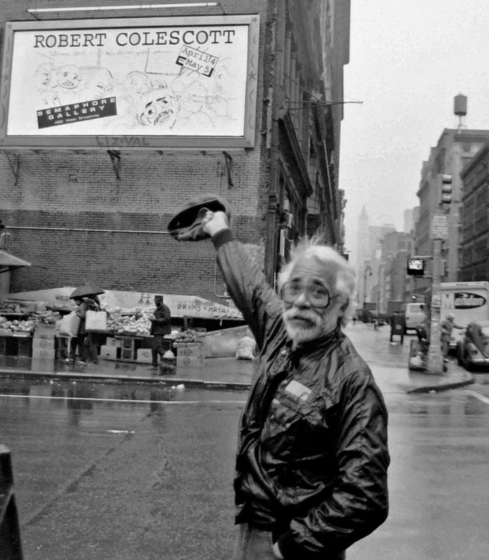 Robert Colescott in front of a billboard on the corner of Houston and Broadway, advertising his 1984 exhibition at Semaphore Gallery. Photo by David Forshtay.