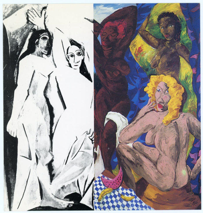 Exhibition announcement for Robert Colescott’s Les Demoiselles D’Alabama (The de-abstraction of a masterpiece) at Semaphore East in 1986. Card size: 5.75″ x 6″