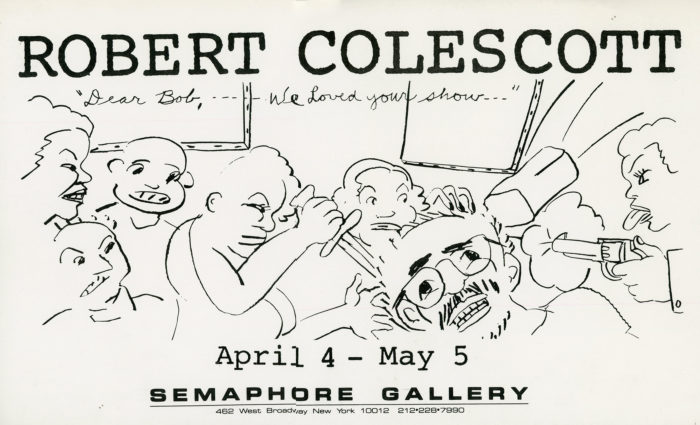 Postcard for Robert Colescott’s exhibition at Semaphore Gallery, January 6-31, 1980. Card size: 4.25 x 6 inches.