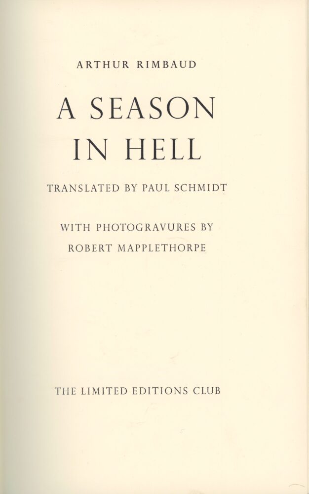 Arthur Rimbaud, A Season in Hell, photogravures by Robert Mapplethorpe, published by the Limited Editions Club, SIGNED by Mapplethorpe and translator Paul Schmidt, 87-page book, 1986.