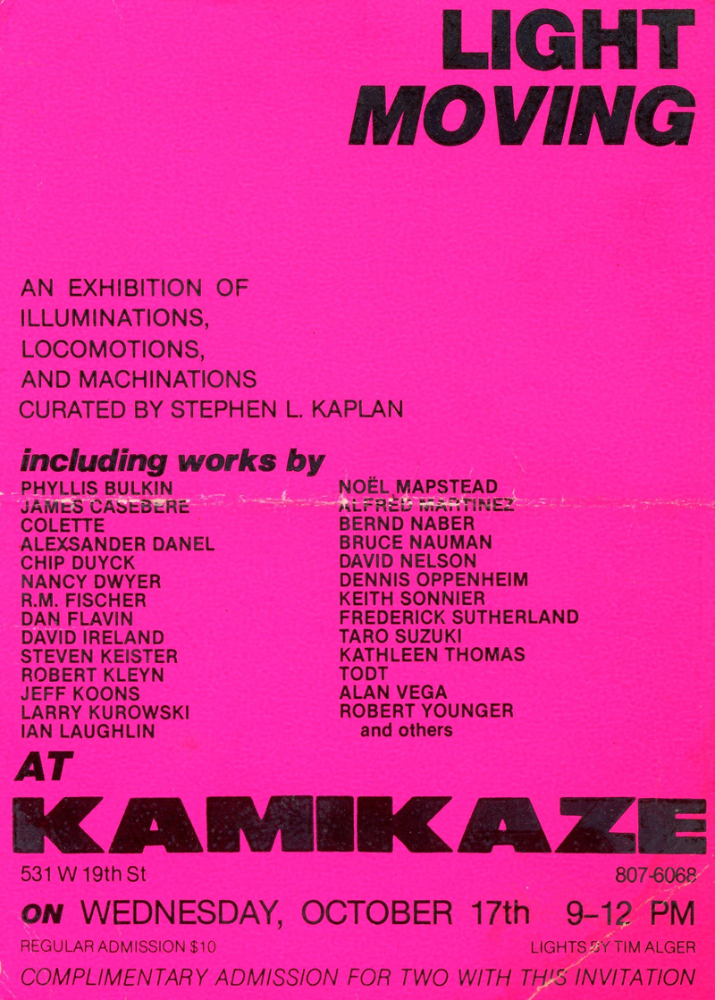 Kamikaze, Light Moving, Colette, Flavin, Koons, Nauman, Oppenheim, Sonnier, Vega, Card, 1984