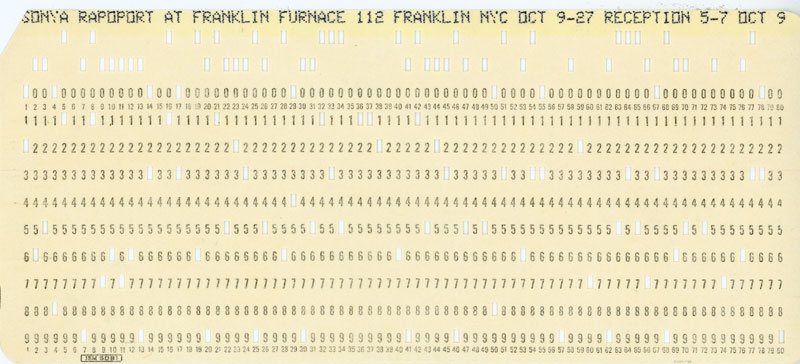 Some of the most desirable gallery announcement cards are those with a portrait of the featured artist. In this regard Franklin Furnaces’ Food for Thought card is an exceptional example of art ephemera because it displays two high profile artists, one on each side of the card.
