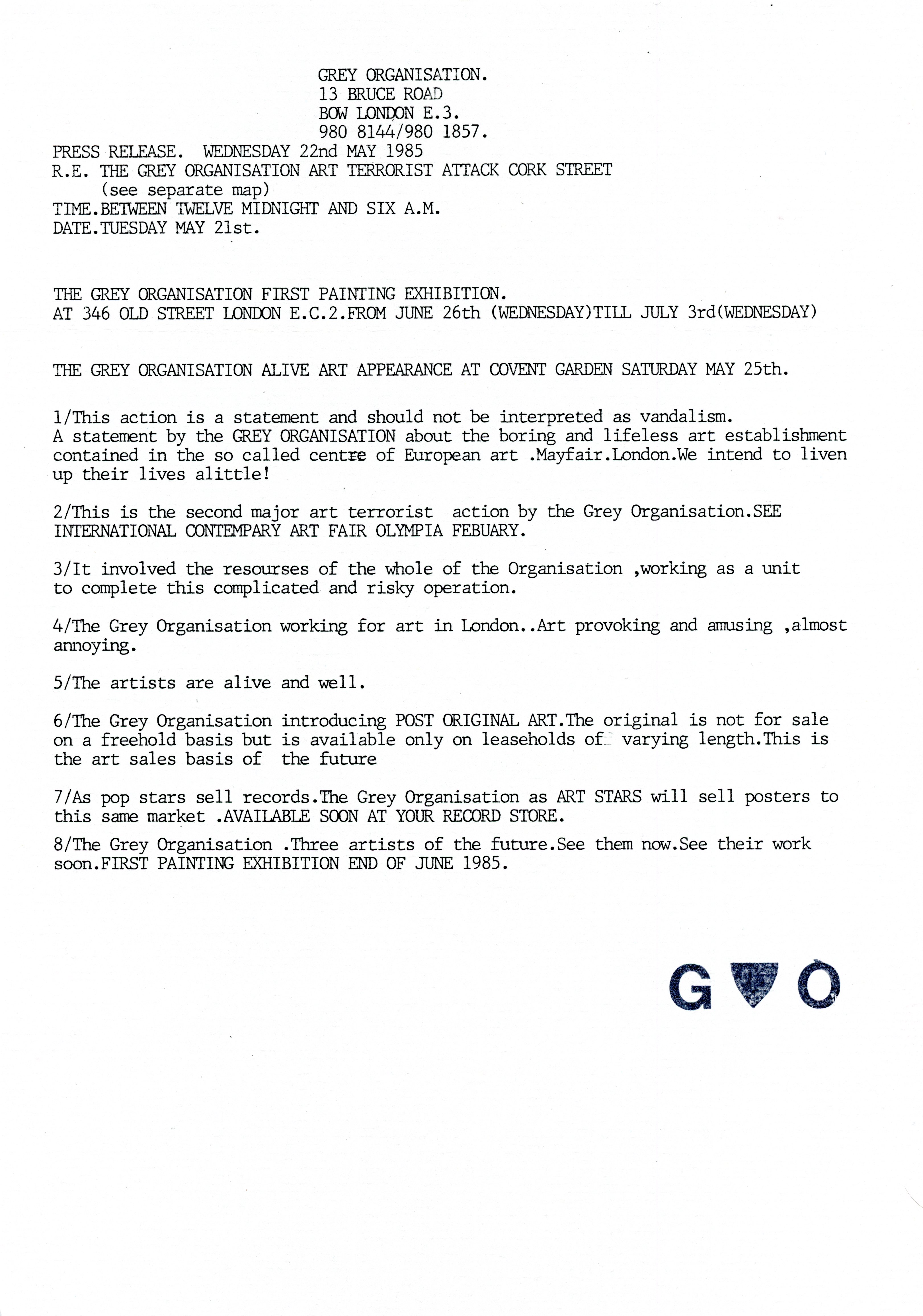 Grey Organisation, Art Terrorist Attack Cork Street, Press Release, 1985