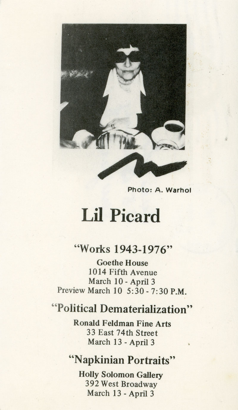 Lil Picard, Andy Warhol, Card, Ronald Feldman Fine Arts, Holly Solomon Gallery & Goethe House, 1976