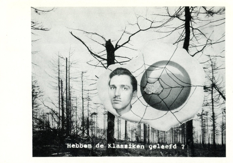 Paul Andriesse surrounded by the initials of gallery artists: Marlene Dumas (M.D.), Erik Andriesse (E.A.), Rene Daniels (R.D.), Albert Oehlen (A.O.), Werner Büttner (W.B.), card for group exhibition, Paul Andriesse Gallery, Amsterdam, NL, 1986.
