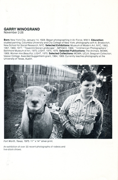 Light Gallery’s announcement cards show the full range of fine arts photography in the 1970s and 80s. Many were older photographers who had developed unique personal styles earlier in the century, while the younger photographers were influenced by contemporary art trends. Light Gallery exhibitions featured Ansel Adams’ landscapes, portraits by Arnold Newman, street scenes by Gary Winogrand, color shots by Stephen Shore, composites by Ray Metzker, and staged photo narratives by Duane Michaels, along with works by Harry Callahan, Thomas Barrow, Nicholas Nixon, André Kertész, Aaron Siskind, Les Krims, Linda Connor, William Klein and many more.