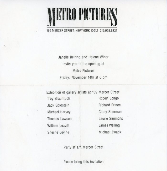 Metro Pictures, Inaugural Exhibition, Folded Paper Invitation, November 14, 1980. Size: 7.5 x 7.5 inches