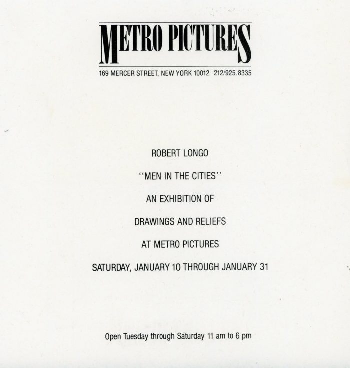 Metro Pictures, Robert Longo, Men In Cities, Folded Paper Invitation, January 10 – 31, 1981. Size: 7.5 x 7.5 inches.