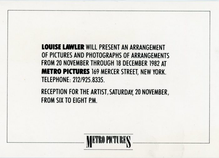 Metro Pictures, Louise Lawler, Pictures and Photographs of Arrangements, Card, November 20 – December 18, 1982. Size: 6 x 4.25 inches.
