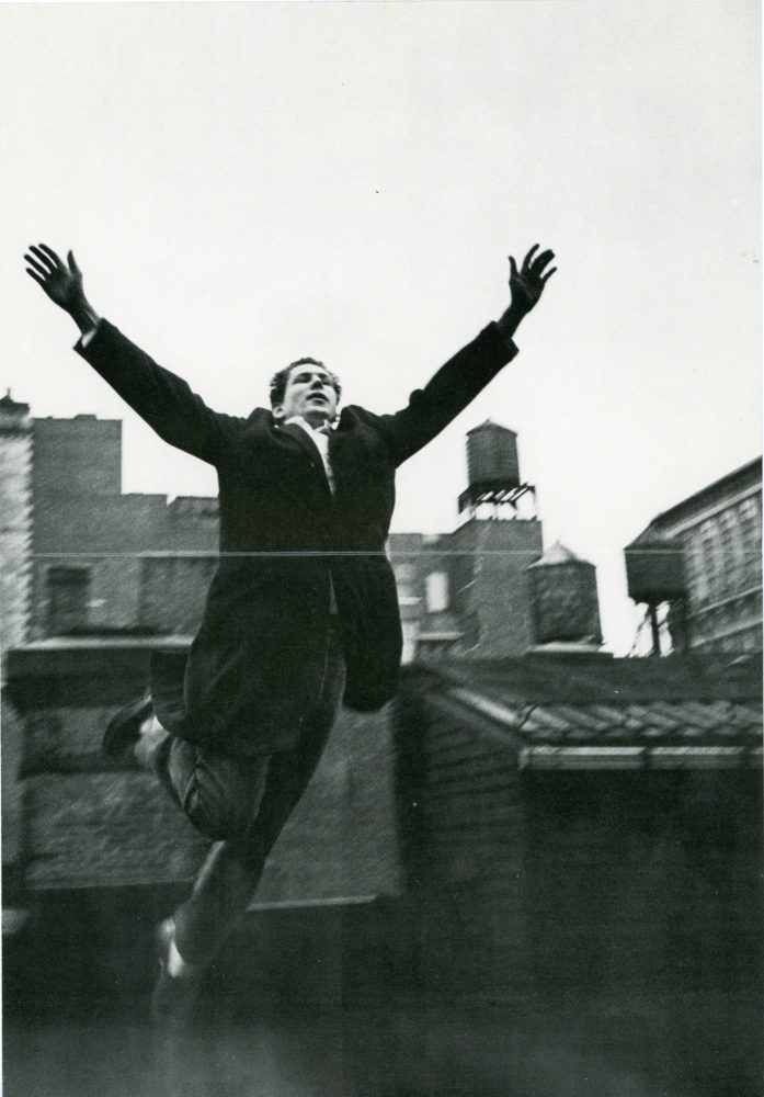 This historically significant card announces Julian Schnabel’s breakthrough two-gallery exhibition at the Mary Boone and Leo Castelli Galleries (although inexplicably only the name of the Boone Gallery appears on this card). Steeped in the mystique of modernism, Schnabel mimics the famous photograph of artist Yves Klein’s Leap into the Void. The photo is by downtown film director Amos Poe who shared Schnabel’s taste for the “romantic” existentialism found in French culture during the early 1960s.
