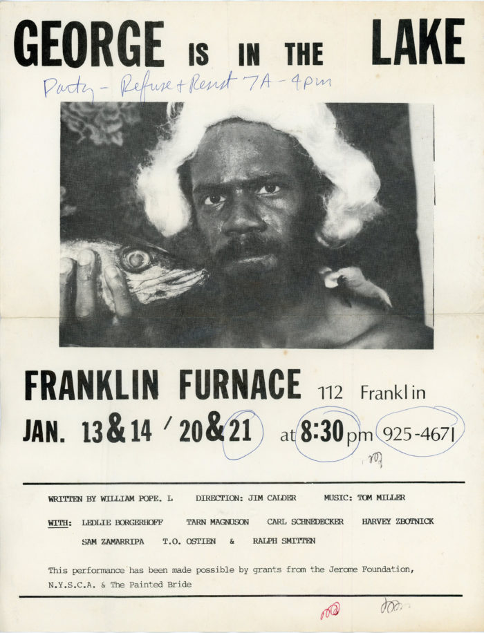 Franklin Furnace, George is in the Lake, a performance organized by William Pope.L and Jim Calder, Flyer with ink notations, January 1989.