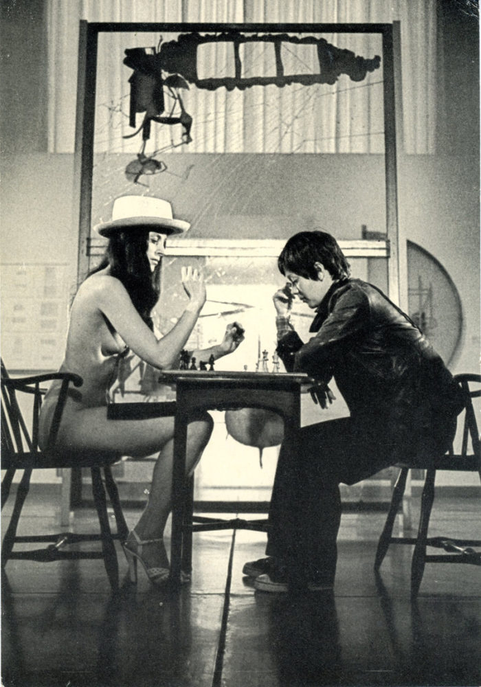 In the 1960s and 70s, Dada artist Marcel Duchamp (1987-1968) enjoyed late-life celebrity and was a major influence on Pop, Fluxus and Conceptual artists. This card announcing a new Duchamp documentary features a still from the film with artist Hannah Wilke (1940-93) that recreates Julian Wasser’s famous photo of Duchamp at his 1963 retrospective at the Pasadena Museum playing chess with a nude Eve Babitz.