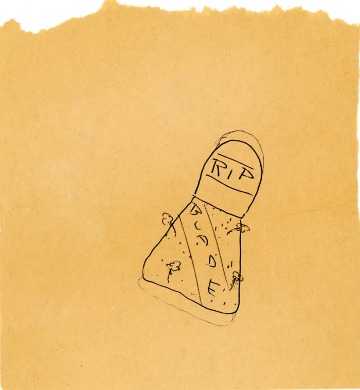 Like other graffiti artists, BLADE found inspiration in comic books and cartoons. This section features sketches and notes that he gave his friend Glazer. In some of these drawings the generally upbeat and optimistic BLADE reveals the difficulties of his itinerant freelance lifestyle. Some even show a fatalistic side that is perhaps a by-product of the dangers he and colleagues once faced while illegally painting trains at night. However, the news of BLADE’s death pictured above is premature. He is alive and well, living in Florida.