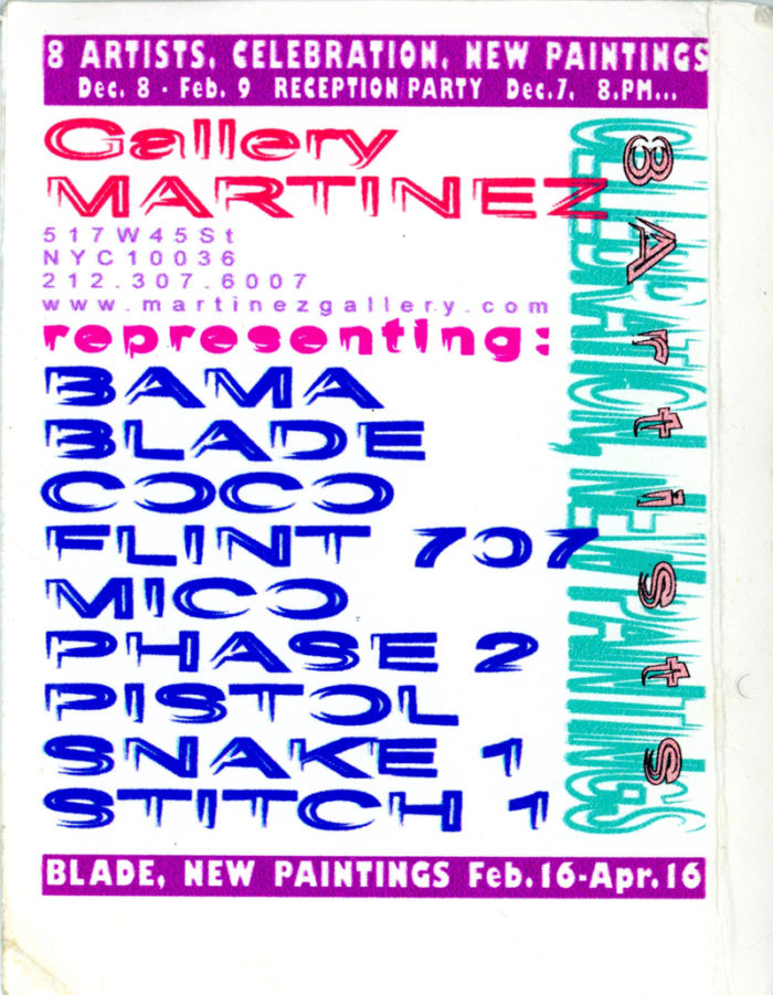 BLADE was included in some of the earliest gallery exhibitions that included graffiti based art. The vogue for graffiti had spread worldwide and the cards and flyers show the Bronx-based artist traveling the globe. Selling paintings was not always easy but BLADE’s prices rose after 2000, and he now jokingly boasts that graffiti paid for his house in Florida.