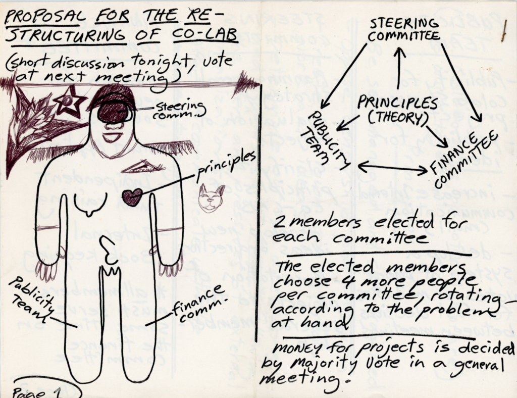The price paid for being a Colab member was engaging in tedious meeting with a lot of talk and debate. In this xerox sheet distributed to members, Tom Otterness suggests ways the group could more effectively organize itself. The handout announces a vote at the next meeting.