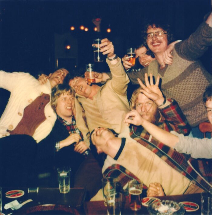 Bettie Ringma & Marc H Miller, Drinking Group at The Old Bell, SX-70 Polaroid photo, 1980