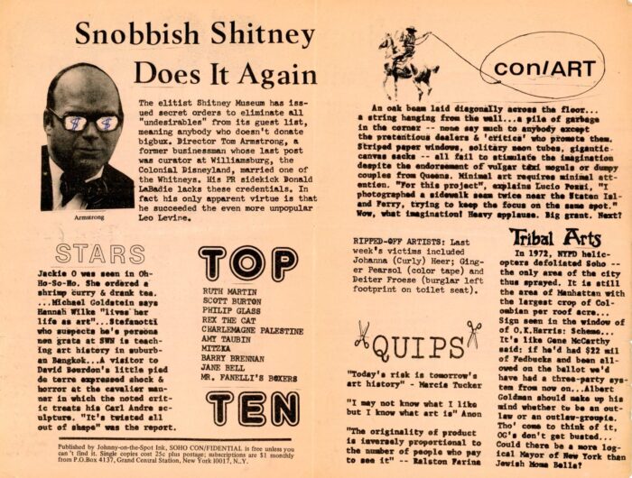 The irreverent downtown writer John Wilcock gave away these satirical newsletters outside galleries on Saturdays in Soho. Consisting of just a single double-sided sheet of colored paper folded down the middle, each sheet probably cost less than 5 cents to make.