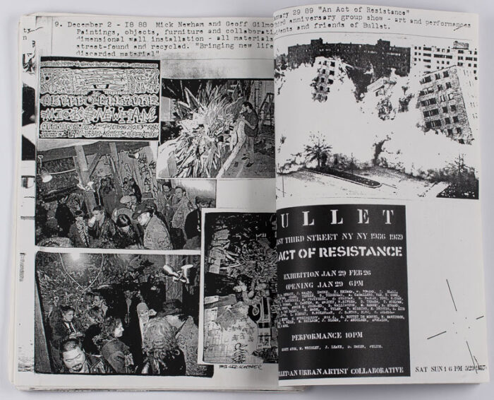 Squatting, like street art and punk music, has an aesthetic connection with D.I.Y photocopy publications. This Xerox book records the early history of Bullet Space, a building squatted by artists in the 1980s.