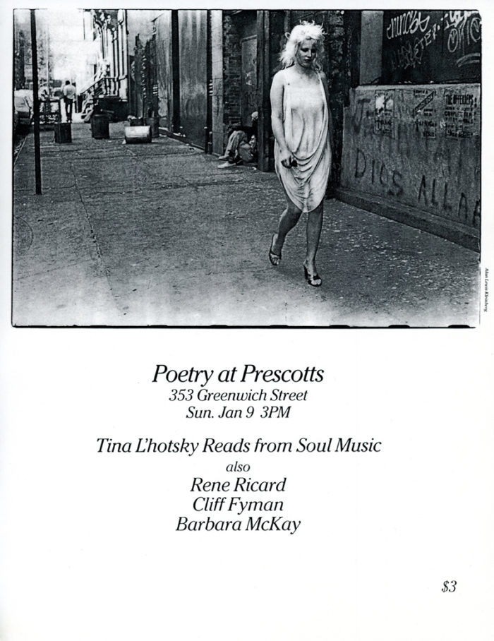 Poetry at Prescotts, Tina L’Hotsky, Rene Ricard, Flyer, 1983. Photograph by Alan Lewis Kleinberg.