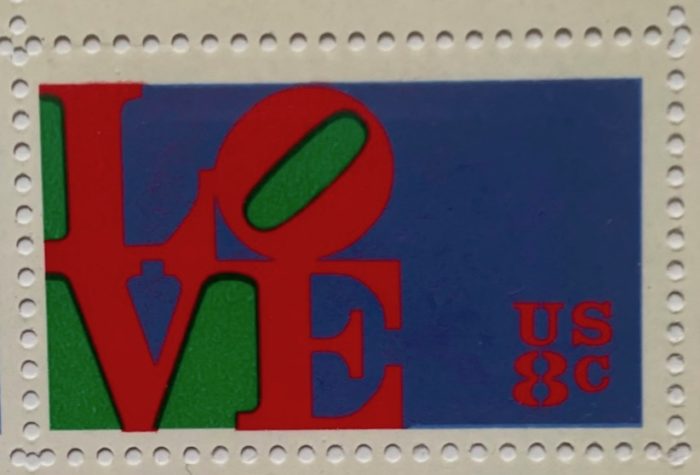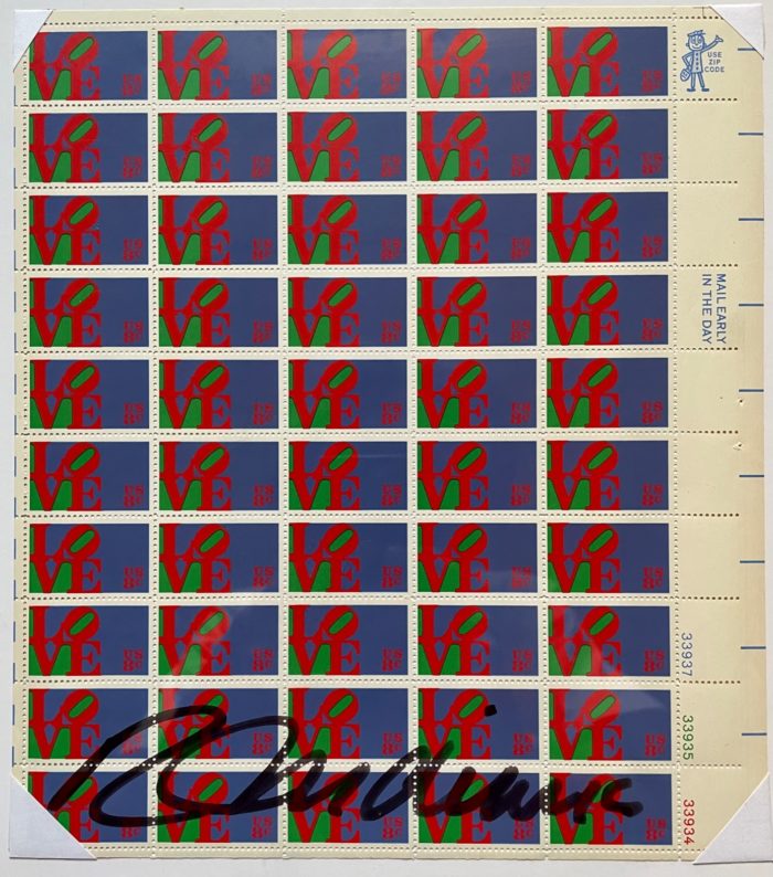 Robert Indiana (1928-2018) created Love in 1965 as a Christmas card for the Museum of Modern Art. In 1970 he reconfigured the image into a public sculpture of which there are now over 50 versions. The Love stamp, issued on Valentine’s Day in 1973, had an initial printing of 320 million stamps! Indiana signed this sheet in 1991 for art collector Todd Brassner, owner of the first Love painting.