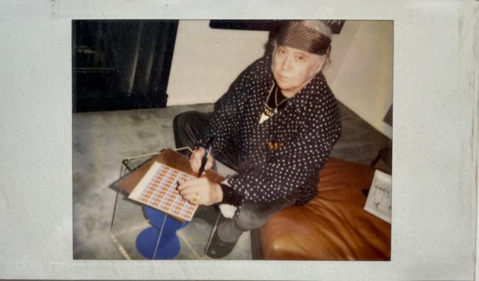 Fifty Love stamps with a Polaroid photograph of Robert Indiana signing the sheet, 1991