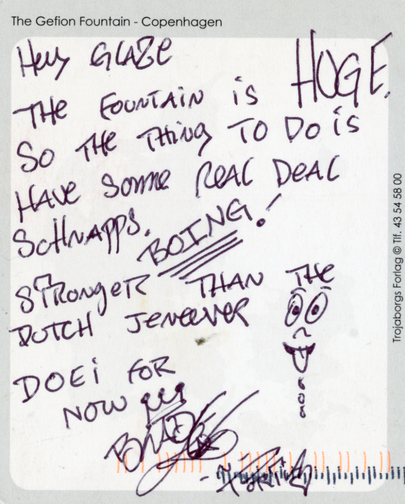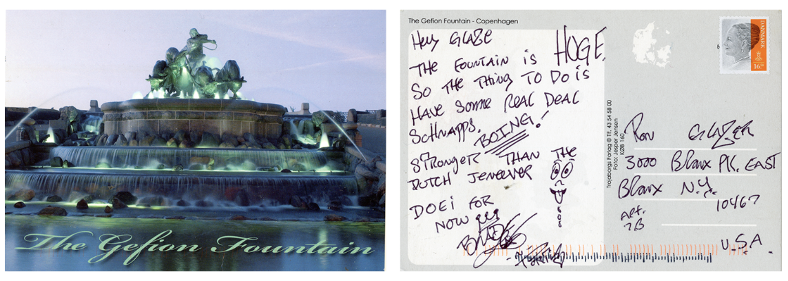Blade, “The Foundtain is HUGE. So The Thing To Do is Have Some Real Deal Schnapps. Stronger Than the Dutch Jenever. Doei for Now.” Postcard sent to Ronnie Glazer from Copenhagen, early 2000s. Size: 6 x 4 inches — Available $100