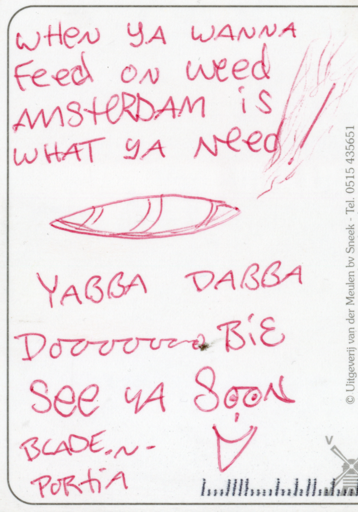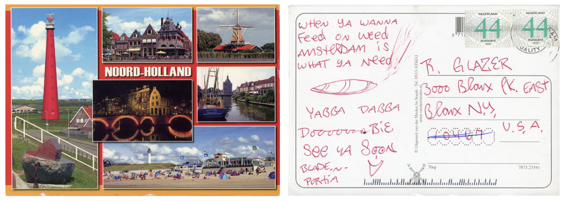 Blade, “When Ya Wanna Feed on Weed Amsterdam is What Ya Need! Yabba Dabba DoooooBie. See Ya Soon,” Postcard to Ronnie Glazer from The Netherlands, 2007. Size: 6 x 4 inches — Available $100