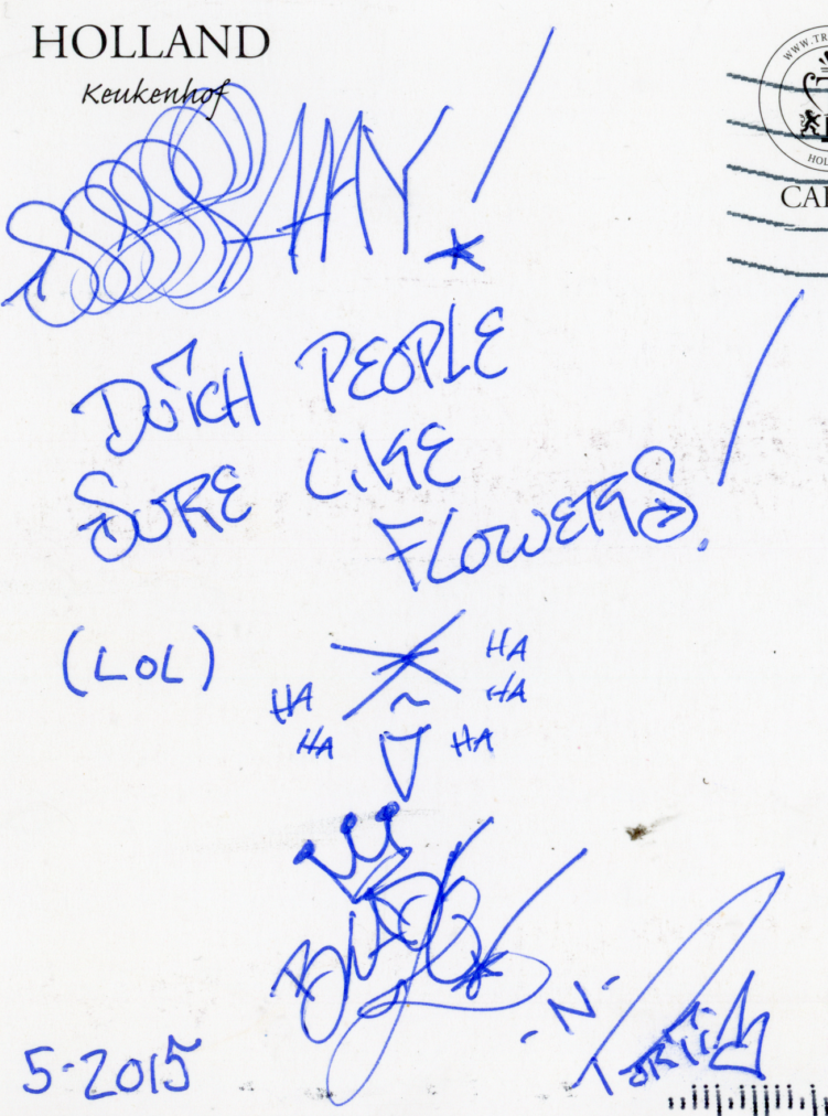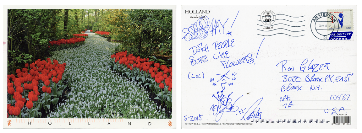 “Dutch People Sure Like Flowers!,” postcard sent from The Netherlands, May 2015