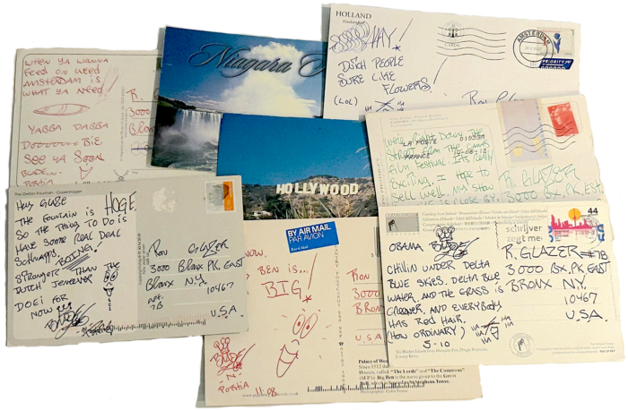 In the collection are approximately 50 postcards that Blade sent to Glazer during his travels around the globe for exhibitions in different cities. The earliest of the cards date from the 1980s and 90s, when Blade began to regularly exhibit in the Netherlands and Europe. Others are from the early 2000s, when Blade was accompanied by his wife Portia, whose name also appears on the cards.