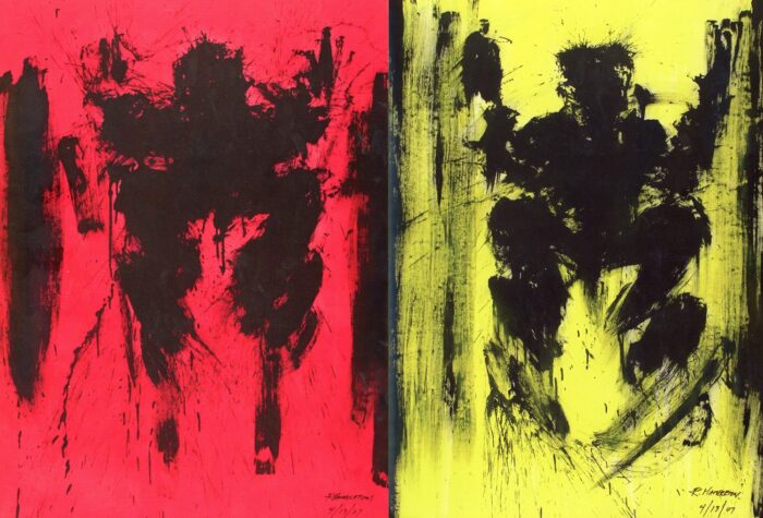 Gallery 98 has been fortunate to acquire the original, large-sized, lushly produced, 64-page catalogue for Richard Hambleton New York. In full-page and double page spreads, the catalogue includes photographs of Hambleton’s street work by Hank O’Neal, along with reproductions of his later works on canvas and found materials. It is surprising to see how effectively Hambleton’s ‘shadow-man’ imagery suited domestic settings.