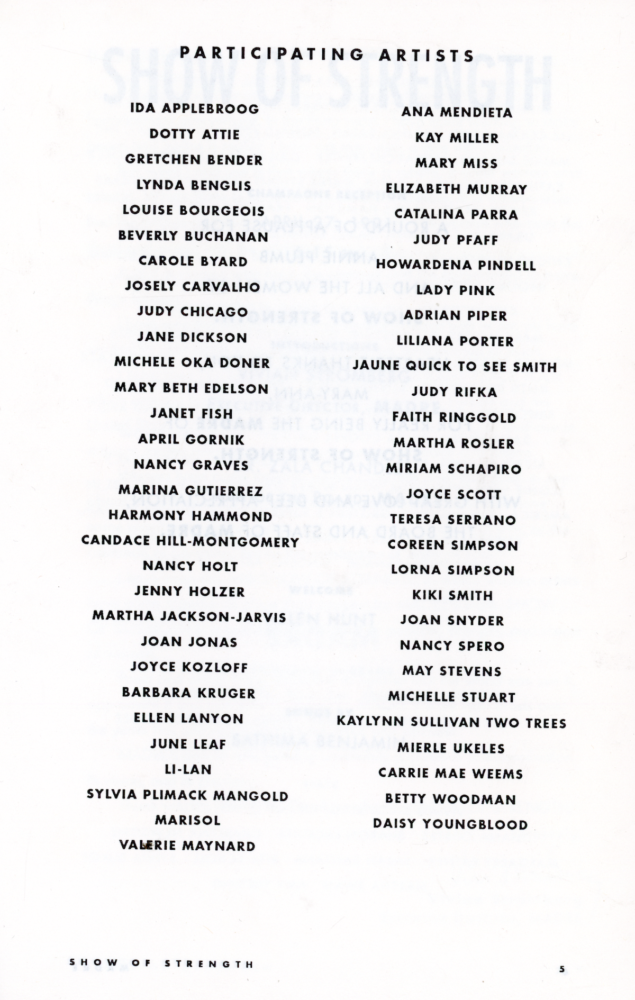Show of Strength, Women Artists Support Madre, Benefit Exhibition Organized by Mary Ann Monforton, Anne Plumb Gallery. Cover Photo (on front and back) by James Hamilton, 31-page Catalogue, 1991. Size: 5.5 x 8.5 inches — Available with folded card