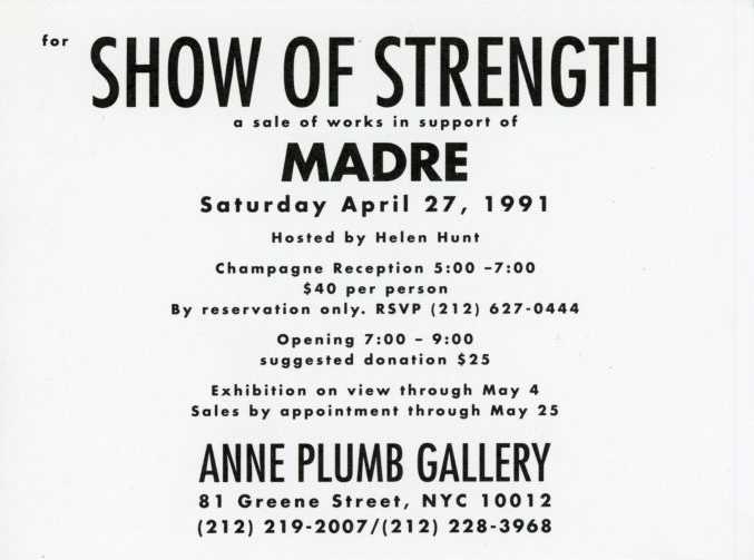 Show of Strength, a benefit exhibition for Madre, Organized by Mary Ann Monforton, Anne Plumb Gallery, Folded Card, 1991. Size: 6.25 x 4.5 inches — Available with catalogue