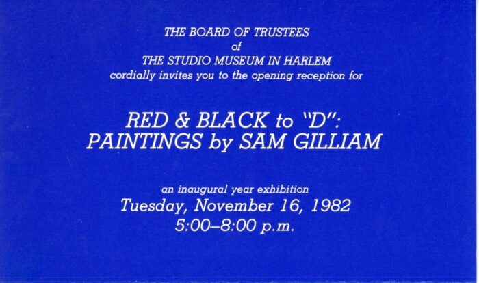Sam Gilliam, Red & Black to ‘D’, Studio Museum in Harlem, Folded Card, November 16, 1982 – February 27, 1983. Size: 4.25 x 7 inches — Available