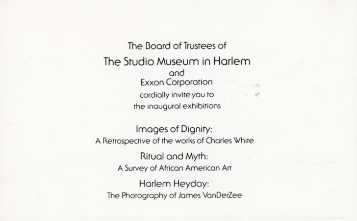 Inaugural Exhibitions at The Studio Museum in Harlem, Images of Dignity: Retrospective of Charles White, Ritual and Myth: Survey of African American Art, Harlem Heyday: Photography of James VanDerZee, Folded Card, June 17, 1982. Size: 4.5 x 6.25 inches (folded) 6.25 x 9 inches (unfolded) — Available