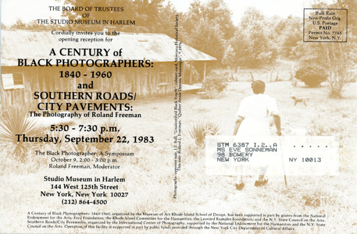 Studio Museum in Harlem, A Century of Black Photographers: 1840-1960 and Southern Roads/City Pavements: The Photography of Roland Freeman, Card, September 22, 1983. Size: 6 x 9 inches — Available