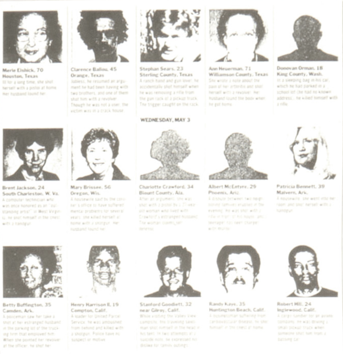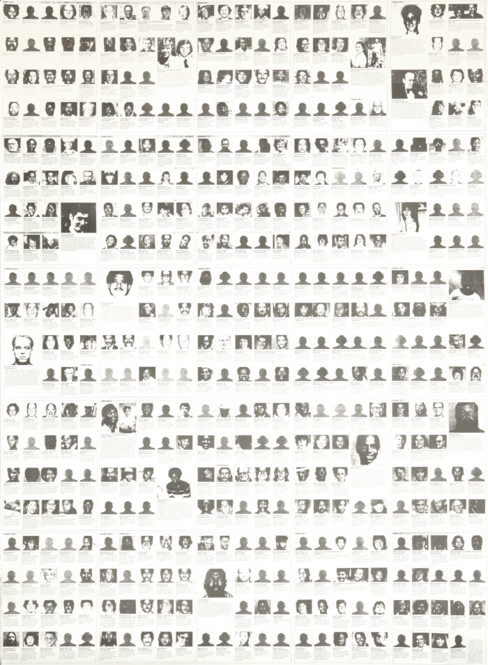 Felix Gonzalez-Torres, Untitled (Death by Gun), Poster, 1990. This poster by Felix Gonzalez-Torres (1957 – 1996) was originally conceived as part of a nine-inch pile of identical posters that gallery goers were free to take. The poster “lists the names of 460 individuals killed by gun in the United States during the week of May 1–7, 1989, cited by name, age, city, and state, with a brief description of the circumstances of their deaths and, in most cases, a photograph of the deceased.”