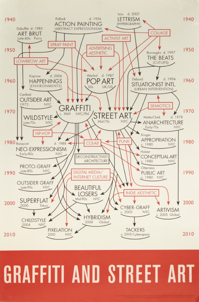 Graffiti and Street Art, Feral Diagram 2.0 by Daniel Feral, Poster, 2011. This diagram strives to contextualize Graffiti and Street Art within the mainstream of art history. It was inspired by the 75th Anniversary of Museum of Modern Art director Alfred Barr’s famous diagram of Cubism and Abstract Art.